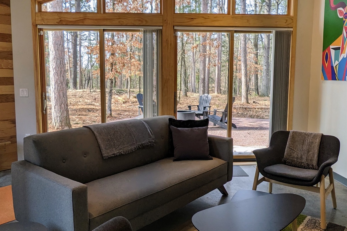 3 Bedrooms • 2 Bathrooms 2 Baths • Sleeps 6-8Welcome to Orange Tractor Retreat! Our newly constructed Deer cabin is one of 5 cabins at OTR, all situated in a large, private cul-de-sac with our namesake Allis Chalmers tractor to welcome you to the Retreat. This cabin features bright, beautiful spaces and functional amenities. Deer is situated to give you the loveliest view of the 40 acres old growth forest and the Wisconsin River. Relax with a cup of coffee or tea when you open the sliding glass doors and walk out to your private patio. There’s Adirondack chair seating, a fire pit, firewood and a gas grill. You’ll love the gorgeous sunrises, and sunsets! (We know we’re in the woods, so we have pest control and mosquito services for the cabin.)
