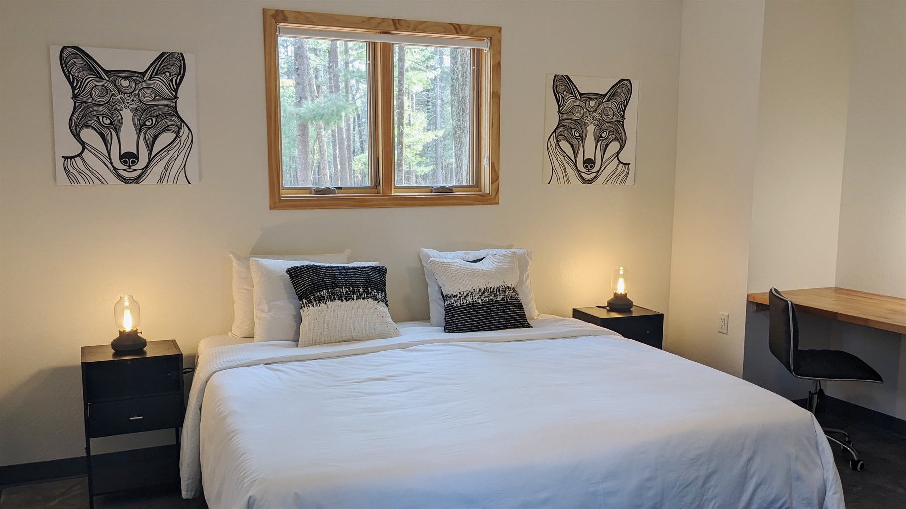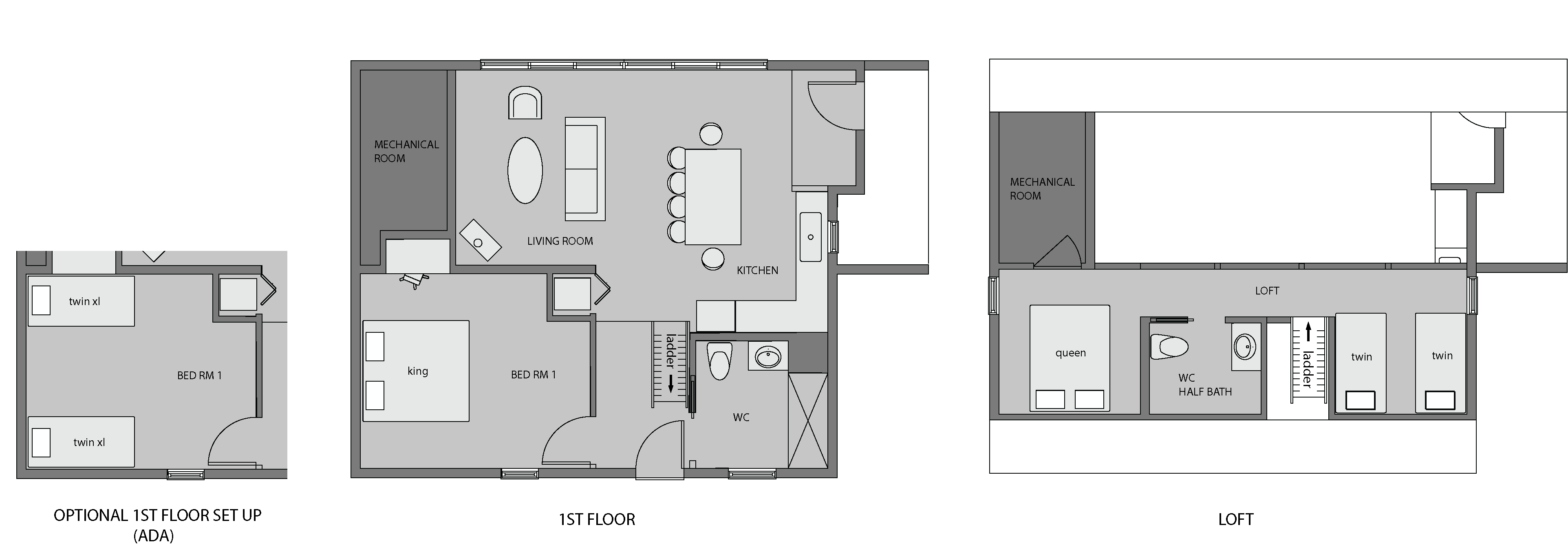 The Fox is special. We can convert this ADA accessible cabin (1st floor) to fit multiple groups. If you have a wheelchair, we’ll make the master bedroom into two twin XL beds to accommodate. If you just want a large king bed, we’ll combine the twins, add a king mattress topper and give you the biggest bed we have. This cabin is a 1 bedroom, 1.5 bath with 2 sleeping lofts upstairs (2nd, 3rd bedrooms). Our Fox sleeps 6 - 8 guests. (See birds eye view photo of upstairs and downstairs layouts.)